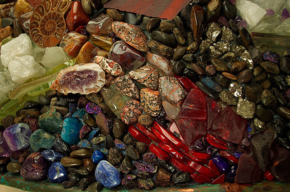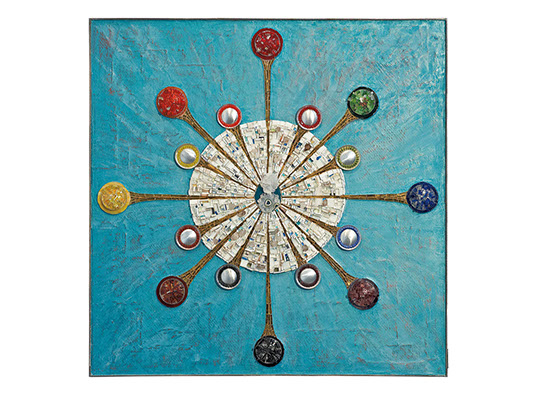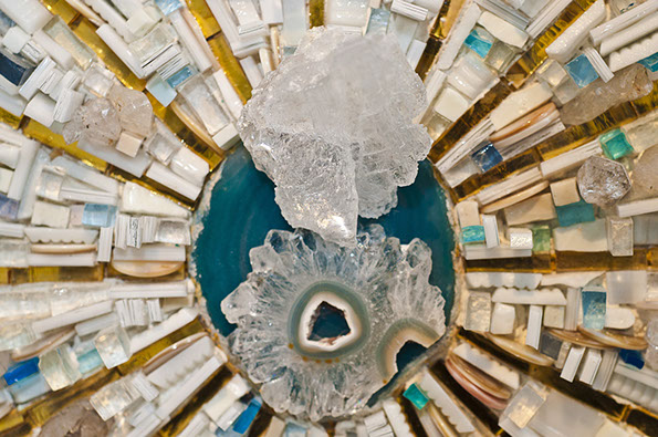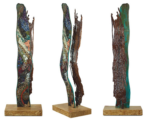 Materiales como cobre, hierro, vidrio, piedras semipreciosas de mármol, así como materiales de reciclaje son su paleta y herramienta principal.